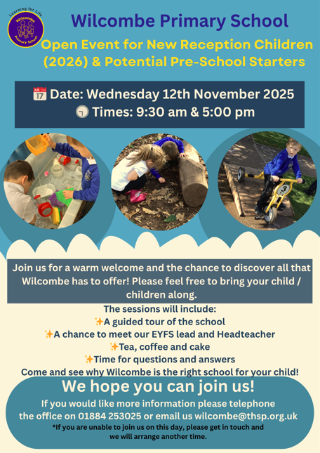 Choosing a school for your child can be an exciting and sometimes daunting decision to make. Our website will hopefully give you a raft of information to support your decision, however, the most powerful tool that you have at your disposal is to visit schools themselves. We welcome visitors to our school, somebody will always be on hand to show you around, to share further information and to answer any questions you may have. Please telephone the school office on 01884 253025 or email wilcombe@thsp.org.uk to arrange a visit.